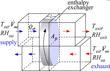 EnthalpyExchanger1_CL models a rotary enthalpy exchanger in which provides heat and mass (water) exchange between two air streams. The device is used to precondition ventilation air from outdoors before it is blown into a building space. The enthalpy exchanger matrix is assumed to be made of a corrugated material, such as aluminum, that has been coated with a desiccant material. Heat exchanger coefficients are found using the Triangular_channels function in the Heat Transfer Convection library. An example of this device is the enthalpy wheel manufactured by Carnes, in Verona, WI as documented in Freud (2003). However, the model should be appropriate for most enthalpy exchanger geometries. The model is based on the following assumptions: