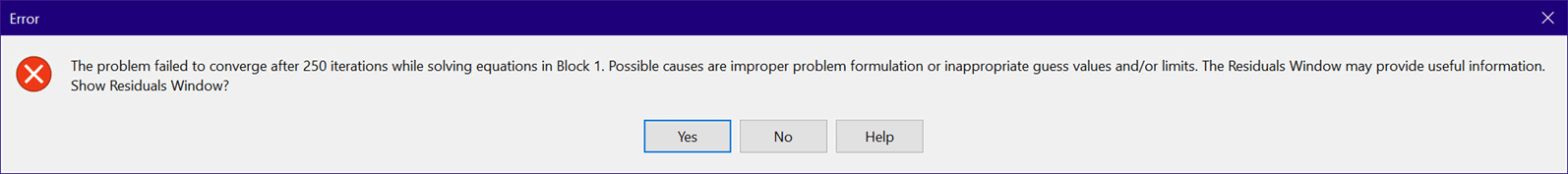 appears when a solution to the equations in a block is not obtained within the number of iterations specified as the maximum in the Stop Criteria dialog, 250 in the example shown above. The common causes for this error message are: