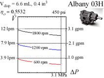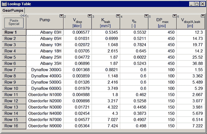 The procedure Gearpump3 provides a model of a specific manufacturer's gear pump. The parameters displacement, leakage constant, overall efficiency, and maximum DP are determined by curve fit to manufacturer's data and are stored in the Lookup Table 'GearPumps.lkt'. An example of the data is shown in the thumbnail above, but there are many other sets of data to choose from.