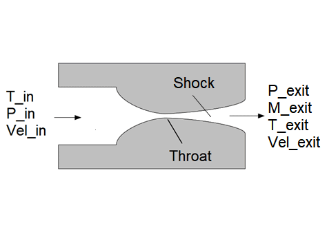 CALL CDNozzle2_CL(Gas$,T_in, P_in, Vel_in, A_throat, A_exit, A_s : P_exit, M_exit, T_exit, Vel_exit, P_crit, P_design)