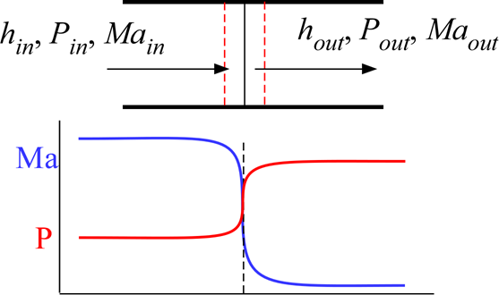 Shock_CL provides a model of a normal shock. This model finds the outlet conditions of the shock that are consistent with continuity, momentum and energy. The fluid can be any ideal gas or real fluid within the EES database. The model does not assume ideal gas behavior of the fluid.