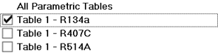 The Parametric Table that is foremost (Table 1 - R134a) is selected by default. Clicking the "All Parametric Tables" item will select all of the tables and hide the drop down display. If the Shift key is not pressed, clicking any of the following table names will unselect all other tables, select the table that received the click, and then hide the drop down display. If the Shift key is pressed, clicking on a table name will toggle its selection and leave the drop down display in place thereby allowing one or more tables to be selected. In this case, the selection process is terminated when the Shift key is released. When more than one table is selected, the row range for each table is either the range that was run during the last calculation for this table or the entire table if calculations have not been done previously.