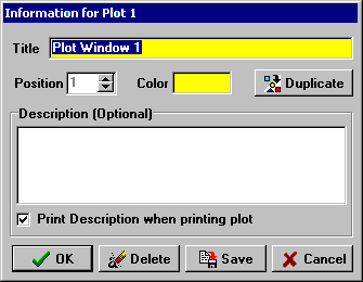 A text string consisting of up to 255 characters is available to store notes or any information you wish for each plot window. The description appears in a hint when the mouse of positioned over the plot window tab. The text string can be printed when the plot is printed. The descriptive text can be added or changed when the plot is generated or by right-clicking on the tab at the top of the plot window.