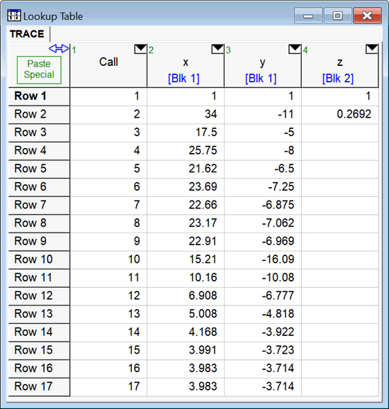 After execution the following Lookup table will be produced. Note that equations are solved in blocks. The block structure is revealed in the Residuals window. The block for each variable in the Trace table is shown below the block name. Calls for variables that are in different blocks cannot be directly compared as they are not occurring at the same time.