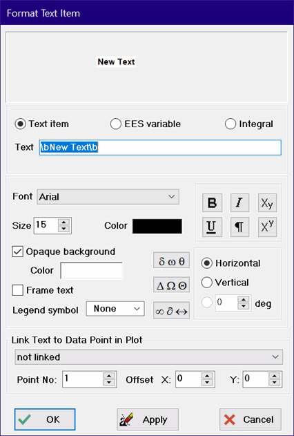 A text item can be added to the plot window by clicking on the text button in the plot window toolbar. When clicked, a new text item will be created and then the Format Text dialog will appear in which information about the text item can be entered. The text item initially appears in a default location on the Plot window. However, it can be dragged to any location on the plot window. The text you enter initially has the characteristics of the previous text item. All of these characteristics can be changed by clicking the right mouse button (or double-clicking the left mouse button) on the text item. This action will bring up the Format Text dialog for the selected text item. The text item can be converted into a plot legend by associating it with a plot symbol in the Format Text dialog. The text can also show the current value of any EES variable or the integral of plotted data. See Format Text for more detail.