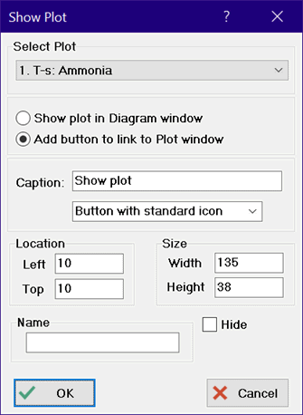 If the Add button to link to Plot window radio button is selected (as shown in the left dialog), a button will be placed on the Diagram window. Clicking this button in Application mode will open and display the selected plot window. If the plot window does not exist, this button will do nothing. The location and size of the plot window access button can be specified in the plot window button dialog. Alternatively, the plot window access button can be dragged to any location when then toolbar is visible. Finer positioning is available by pressing the left, right, up, or down arrow keys which move the button one pixel for each press. The width and height of the button can be changed by holding the Ctrl key down while pressing arrow keys. The right arrow increases the button width by one pixel. Left arrow decreases the width. Down arrow increases the height and up arrow reduces the height.
