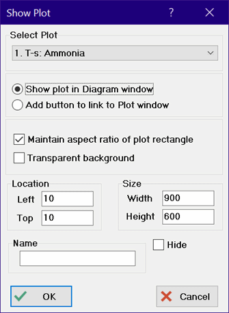 If the Show Plot in Diagram window is selected (as shown on in the figure on the right), the selected plot will be displayed in the Diagram or child Diagram window and it will be automatically updated when the Plot window is updated. This capability is only available in the Professional license. The location and size of the plot can be specified using the edit controls at the bottom of the dialog. In addition, the plot can be dragged to a desired location and resized in the same manner as for any of the other graphic items while in the Development mode. If the Maintain aspect ratio check box is selected, the height to width ratio of the plot will be maintained when the plot is resized. If the Transparent background check box is selected, the plot will be drawn in the Diagram window in a transparent manner so that the contents of the Diagram window behind the plot can be seen.