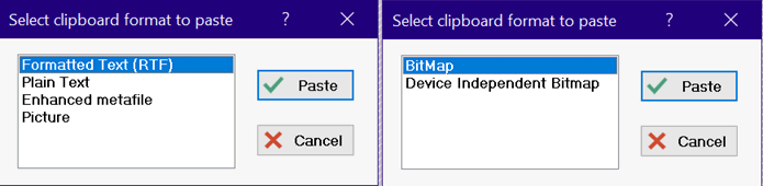 Enhanced metafile, Picture, Bitmap, and Device Independent Bitmap will all paste the selection into the Diagram window as a graphic, rather than editable text. It will not be possible to edit the text or graphics that is pasted. An advantage of this choice is that the selection will be pasted exactly as it appeared in the original program. The Bitmap and Device Independent Bitmap usually more memory. Enhanced metafile is the recommended choice, if it is available.