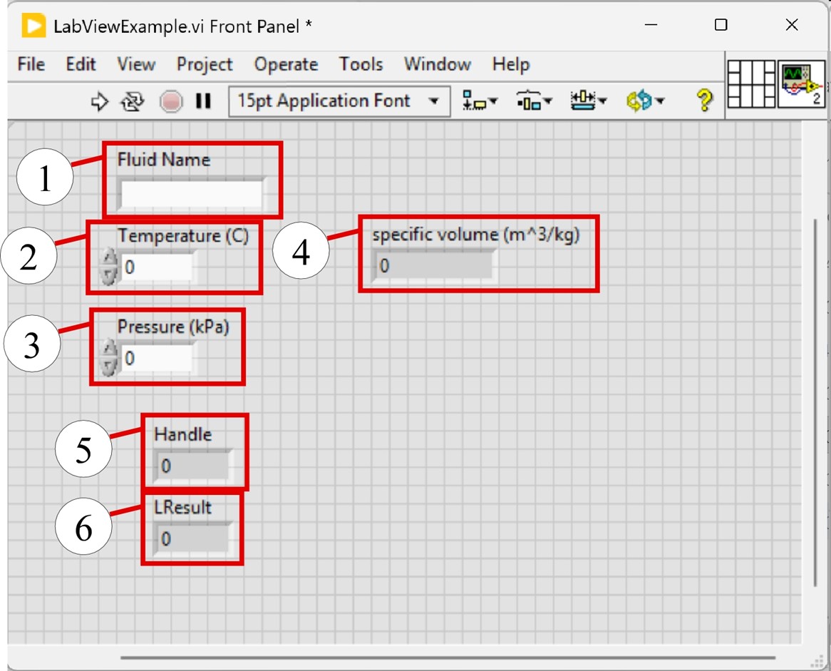 The figure below illustrates the front panel of the LabView vi which has 3 controls (labeled 1, 2, and 3) allowing the user to enter a string for the fluid name (1) and two numbers (2 and 3) corresponding to the temperature and pressure. The front panel also contains 3 indicators (labeled 4, 5, and 6) corresponding to the calculated value of specific volume (4) as well as the Windows Handle for EES (5) and the result returned by the SendMessage command (6). The last two indicators are only for debugging and could be removed.