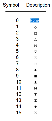 Symbol controls the type of symbol that is drawn at the location of each plotted point for the specified plot line. It must be an integer or a predefined EES variable that has a value ranging between 0 and 15. The relation when the integer value and symbol type is as follows.