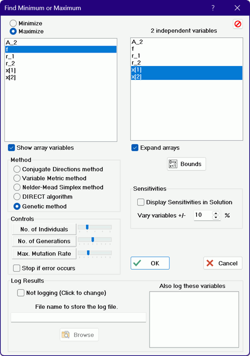 Stop if error occurs will cause the optimization to stop if an error is encountered during the calculations. In most cases with a well-formulated problem, it is best to leave this option unchecked so that EES can continue to look for an optimum solution.