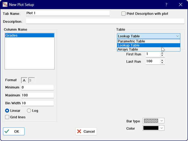 A histogram provides a bar chart showing the number of occurrences of values within specified intervals. For example, consider a column of values in a table that range from 0 to 100. The histogram plot can create bars indicating the number of values between 0 and 10, 10 and 20, and so on. A histogram can be created from any EES table. Only one column of values is required. String values cannot be used.