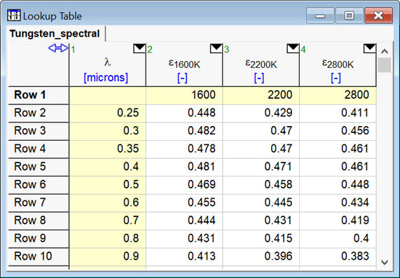 The capabilities of the INTERPOLATE2DM function are best illustrated by example. Shown below is a Lookup table containing the emittance of tungsten as a function of temperature and wavelength. Note the temperature values are provided in the first row and the wavelength values are provided in the first column. The remaining (unshaded) cells contain emittance values at the specified temperature and wavelength. The following example will estimate the emittance at 2000 K and 0.55 microns.
