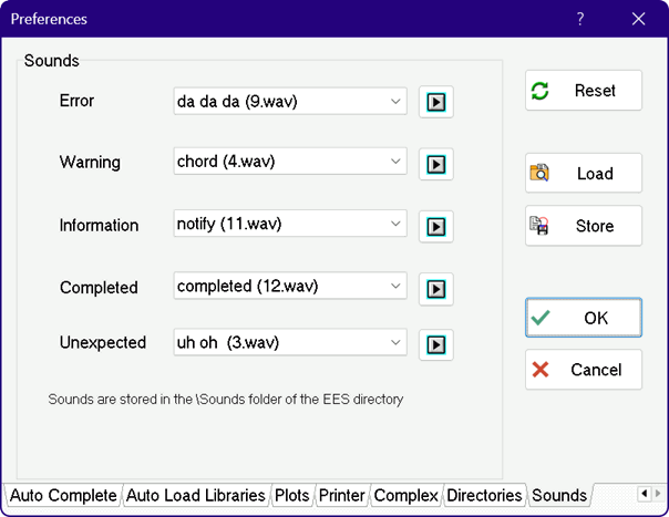 All of the sound files (except none and beep) are provided with .wav files that are stored in the Sounds folder within the EES directory. A total of 15 different sounds are provided. User-selected sound files may be substituted in place of the existing sound files by renaming them n.wav (where n is an integer between 2 and 15) and copying the file into the Sounds folder, thereby replacing the existing sound file.