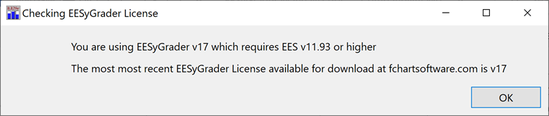 Open EESyGrader either by selecting the application from the Startup menu or by clicking on the EESyGrader.exe application that is installed in the /Userlib/EESyGrader folder in the folder where your Academic license of EES is installed. Initially you will see a message like the one shown below that indicates the version of EESyGrader that you have installed and the associated version of EES that you must be using. The latest version of EESyGrader available for download is also indicated.