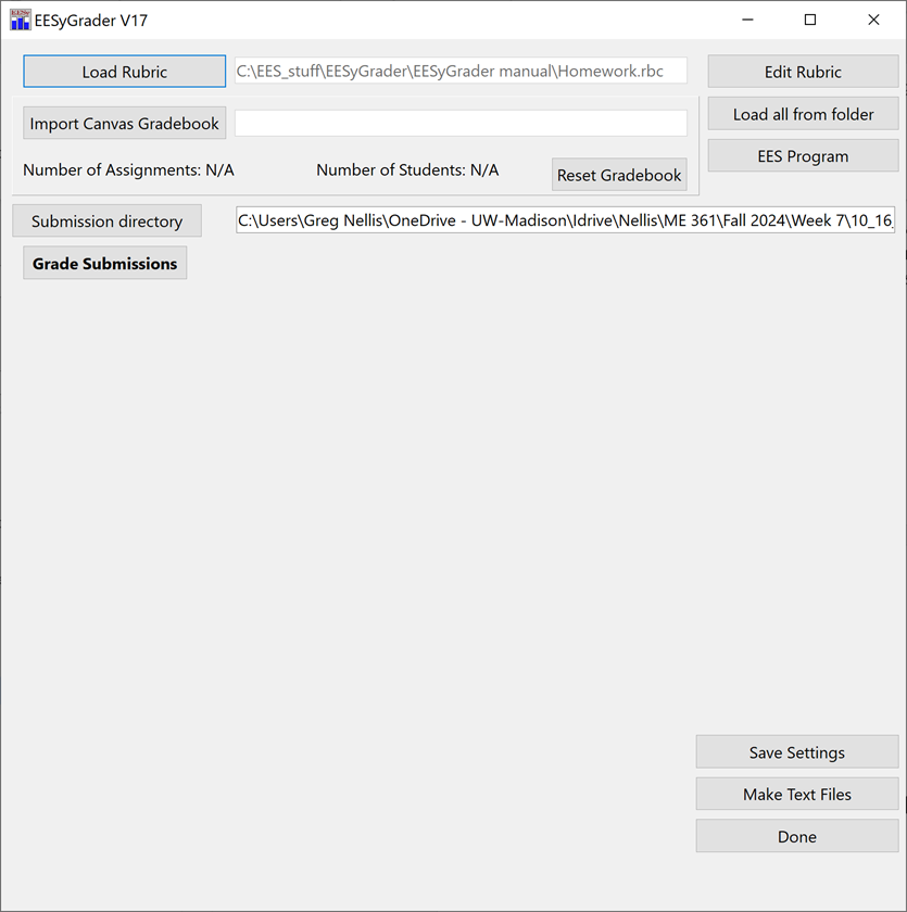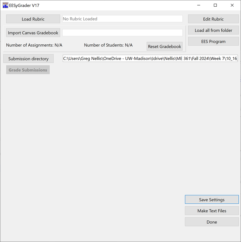 Select the Save Settings button to save the selections you've made for the submissions directory, gradebook file (if one is present), rubric file, and EES file so that EESyGrader will default to these directory locations when opened again.