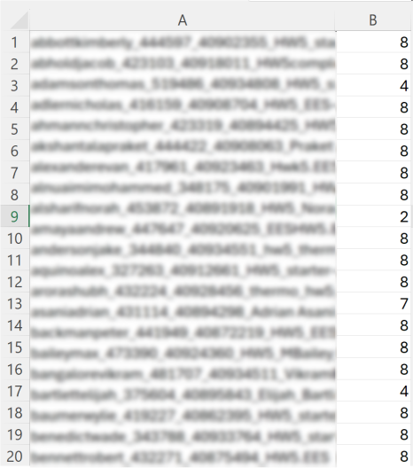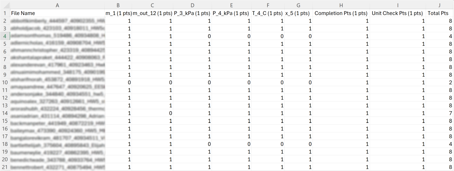 The second radio button (category grades included) creates a .csv with a column for each of the categories that together make up the total grade, as shown below.