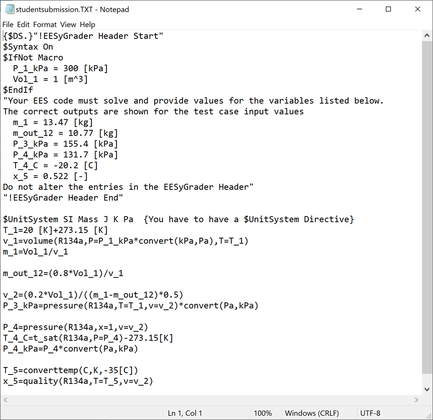 EESyGrader will then activate EES and open each of the submissions in order to save it as a .txt file with the same name in the selected directory. The .txt file will only contain the information that was found in the Equations Window, as shown below.
