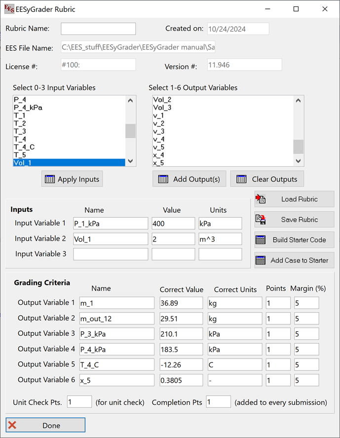 Now select Create EESyGrader Rubric from the Options menu and you should see that the values of the input and output variables have been repopulated with their current values, as shown below.