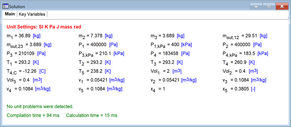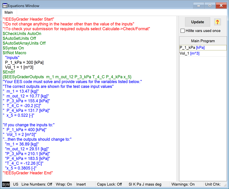To add a second test case, select Done in the EESyGrader Starter Code Dialog and again in the EESyGrader Rubric Dialog. Then change the values of the input variables in your EES solution and solve. For example, in my sample EES program shown below I have changed the values of P_1_kPa and Vol_1 from 300 kPa and 1 m3, respectively to 400 kPa and 2 m3.