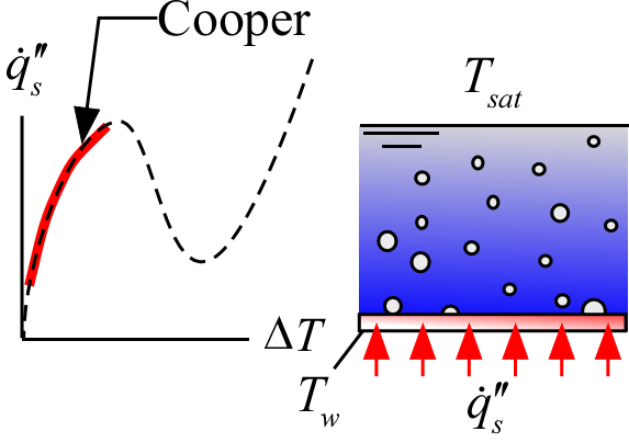 The function Nucleate_Boiling_Cooper(Fluid$, T_sat, T_w, R_p) returns the surface heat flux for nucleate boiling of a fluid. This correlation is presented in Chapter 11 of Ghiaasiaan (2008) and is based on the work of Cooper (1984).