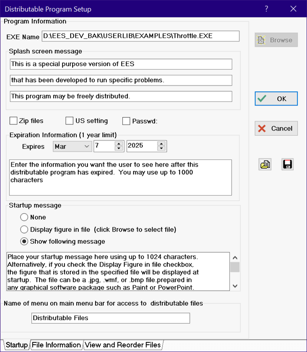 When the distributable program is started, it will display the EES splash screen with the 3 line message that you provide in this dialog. You can supply blank fields here, but that is not recommended.
