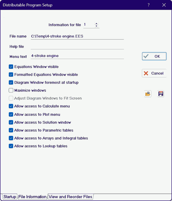The File Information tab allows information to be entered for each EES file that you wish to include with the distributable program, as shown above. Select the file you wish to enter information for using the control at the top of the page. You must enter the name of the EES file in the first edit field. Use the Browse button to make this selection process easier. Note that you can select more than one file with the browse button for the file name field. In this case, the selected files will entered sequentially. The EES files will be copied into the distributable file that is created, so they do not need to be provided with the executable program. The next edit field allows you to enter the name of a help file that will provide help information specific to this EES program. The help file can be of four types: an ASCII text file (*.txt), a .pdf file, a Windows help file (*.chm) or an HTML file (*.htm). EES will automatically determine the file type independently of the file name extension. The Help file will be associated with a menu item appearing in the Help menu.