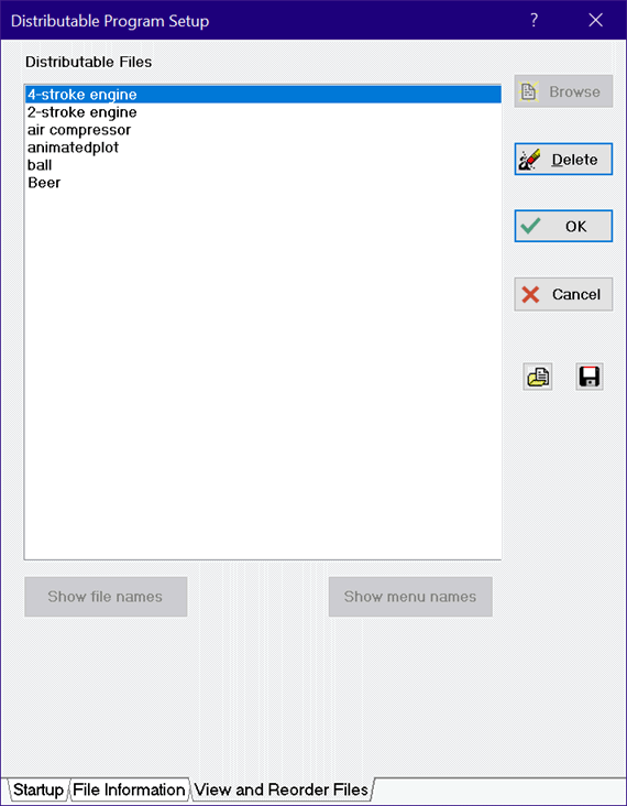The View and Reorder Files table shows a list of all of the EES files that have been selected for inclusion in the distributable program. The files are initially shown with their shorter menu name, but the complete file names can be shown by clicking the Show menu names button. The files can be reordered in this window by clicking on a file name in the list and dragging it to its desired position. Clicking the Delete button will remove the file from the list. Note that a hyphen can be supplied as a file name. When the distributable program is started, the hyphen will be changed into a horizontal menu separator bar, allowing some order to be imposed in the list of files accessible by the distributable program.
