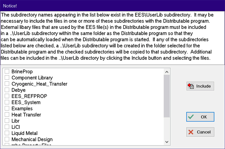 This dialog shows all of the subdirectories containing library files that are installed in the USERLIB (or USERLIB64 for the 64-bit license) folder in your installed version of EES. The EES file(s) in your distributable program may require one or more of these files. EES will create a USERLIB folder in the directory you specified for the distributable program and it will copy all of the files in the subdirectories that are checked in this dialog to the USERLIB folder in that directory. The USERLIB folder must be included with the distributable program for it to properly function. If you select the Zip Files option, the subdirectories that you select will be included in the resultant .zip file. In addition, you can select any files that you wish to include in the USERLIB folder for the distributable function using the Include button.