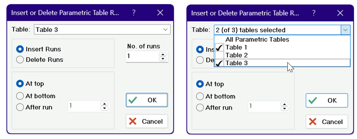 Insert/Delete Runs allows the number of runs in one or more selected Parametric Tables to be changed by inserting or deleting one or more rows at a specified position.