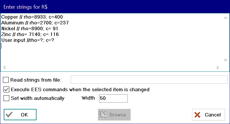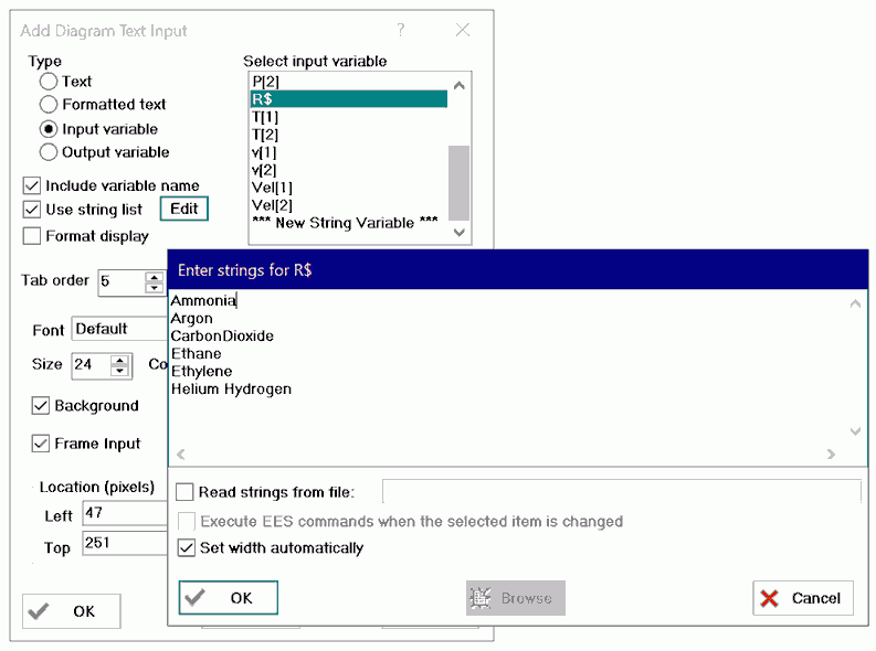 The Read strings from file option is available in the Professional license. In this case, the string information resides in a separate file. EES will check the date-time stamp of this file each time it displays the drop-down list and update the choices as needed. The Read strings from file option allows the string choices in the Diagram window to be changed without any required changes in the EES file or the EES Distributable program.