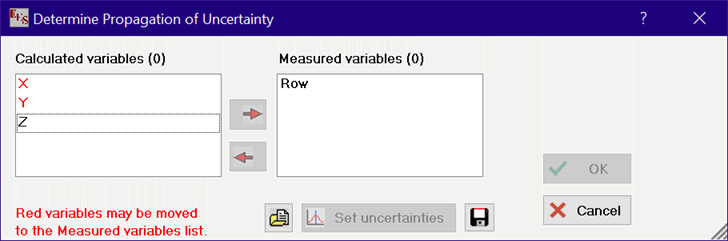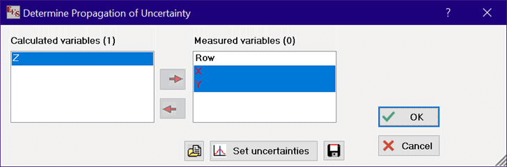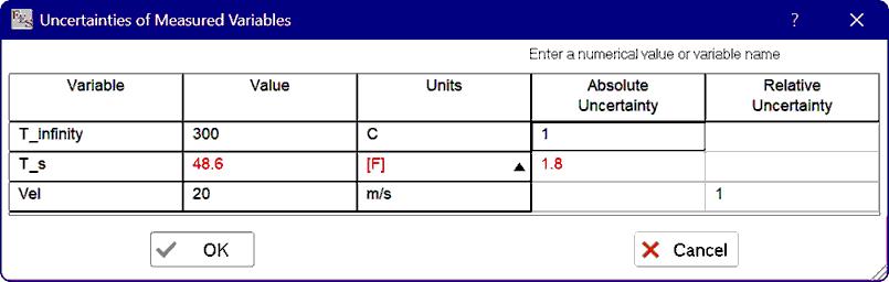 Select one or more variables (up to 6 for the Annual license, 12 for the Commercial license and 50 for the Professional license) for which the uncertainty propagation is to be determined from the list on the left. Select one or more Measured variables from the list on the right. The maximum number of Measured variables is 10 for the Annual license, 30 for the Commercial license and 200 for the Professional license. To specify the uncertainty associated with the Measured variables, click the Set Uncertainties button below the right list. A second dialog window will appear in which the absolute or relative (fraction of the measured value) uncertainties for each selected measured variable can be specified. An uncertainty value for each measured variable must be provided. Note that the uncertainty value can be supplied using another variable. Click the OK button to set the uncertainties and close the Specify Uncertainties dialog window. Click the OK button Uncertainty Propagation dialog to start the calculations.