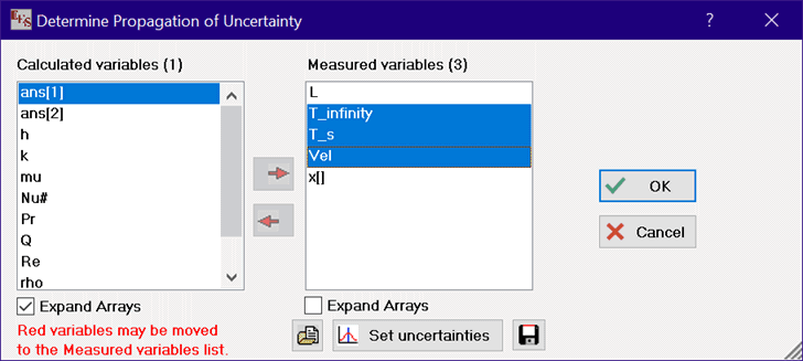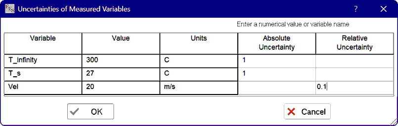 Next, click the Set Uncertainties button and enter the uncertainty values for the Measured Variables.
