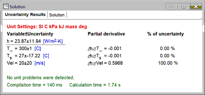 Click OK for both dialogs to initiate the uncertainty calculations. After the calculations are completed, EES will display an abbreviated Solution Window containing the calculated and measured variables and their respective uncertainties. The uncertainty associated with the calculated variable can be assigned to another EES variable using the UncertaintyOf function. The partial derivative of the calculated variable with respect to each measured variable will be displayed. In addition the % of the total uncertainty in the calculated variable resulting from the uncertainty in each measured variable will also be displayed. This % is calculated as the ratio of the square of the product of the partial derivative and uncertainty of each measured variable to the square of the uncertainty in the calculated variable.
