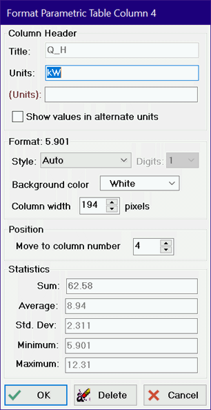 The sum, average, standard deviation, minimum and maximum of the values in the selected column are displayed in the Statistics box. The values in these boxes can not be edited, but they can be copied. If a column holds the results from an Uncertainty Propagation Table command, the Sum field will display the sum value along with the uncertainty of the sum calculated as the square root of the sum of the squares of the uncertainty values in the column. Note that the sum of values in a Parametric table column is displayed when the "Include a Sum Row in the Parametric Table check box is selected in the General tab of the Preferences dialog. Also, the SUMPARAMETERIC and SUMLOOKUP functions return the sum of the values in the Parametric and Lookup tables, respectively.
