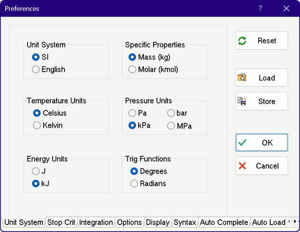 The Store button will save the unit system information along with information on other tabs in the Preferences dialog in an EES Preferences (*.prf) file in the working directory. Unit system specifications are saved with other file information when an .EES file is saved so that the Store button is needed only to store default values in a .prf file. An existing .prf file from any directory can also be loaded with the Load button or with a $INCLUDE directive.
