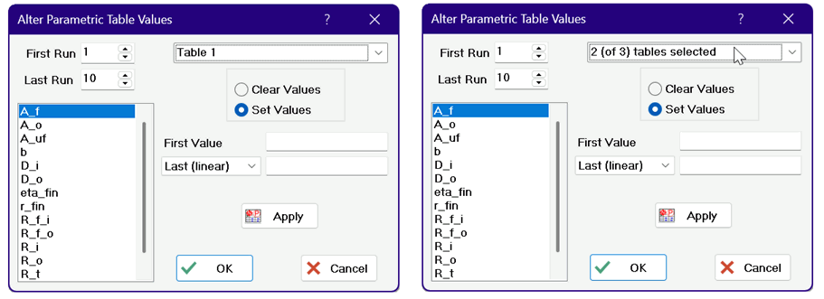 The Alter Values dialog that appears after selecting the Alter Values command from the Tables menu is shown in the figure on the left. When there is more than one Parametric table, the Alter Values command initially shows data for the Parametric table that is foremost. If there is more than one Parametric Table, clicking on the table name will allow other Parametric tables to be chosen. It is possible to have the Alter Values dialog operate on more than one table. To do so, click on the table name or the down arrow at the right of the table name. The list of available Parametric tables will be displayed, as shown in the figure on the right. Hold the Shift key down while clicking on the table names in this dropdown list to select or unselect the tables for which the changes will be applied. If a selected table does not contain the selected variable (shown in the list at the left of the Alter Values dialog), that table will be skipped.