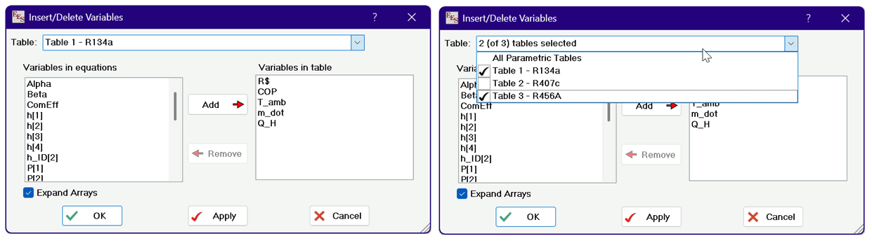 Insert/Delete Vars allows additional variables to be added to or removed from one or more selected Parametric Table(s).