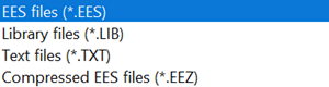 Library type saves the file with a .LIB file name extension. If a file is saved as a library file with a .LIB file name extension in the USERLIB\ subdirectory, the functions, procedures, modules and subprograms in that file will be automatically read in when EES is started. Library files can also be read using the Load Library command or the $INCLUDE directive. See Library files for additional information.