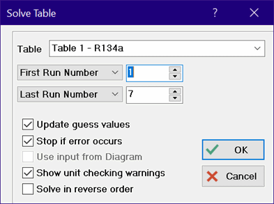 If Solve in reverse order is checked, the table will be solved starting with the last run and proceeding to the first run. Under most circumstances, the order does not matter, but it may affect the convergence when Update guess values is selected.