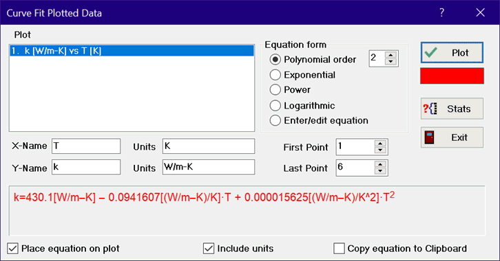 Note that if the plotted variables have units, the coefficients in the curve fit will also have units, which are included with their values. If the curve fit is copied into Equations window with the units information, EES will not display unit warnings. If you do not want to have the units included in the curve fit equation, clear the Units edit boxes for both the X and Y variables before clicking the Fit button or uncheck the Include units checkbox. Note that units for the coefficients are not determined for the Enter/Edit equation option.