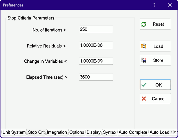 If the OK button is pressed, the changes made in the Stop Criteria parameters, as well as the parameters on other tabs, will be in effect only for this session. Note, however, that the Stop Criteria parameters are stored along with other information in the .EES or .EEZ file (.EES64 or .EEZ64 for the 64-bit license) when the Save or Save As command is used. The setting are restored when the file is opened with the Open command. If the Store button is pressed, all of the information in the Preferences dialog, including the Stop Criteria, will be stored in a specified .prf file. If the .prf file is stored in the working directory, it will be automatically loaded when EES is started. Alternatively, the Load button can be used to load a previously stored .prf file from any directory.