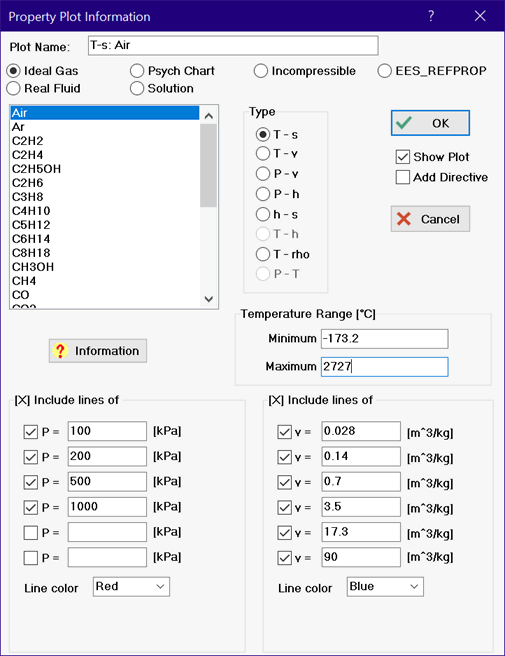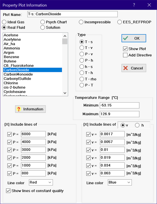 For Ideal Gas and Real Fluid substances, eight buttons are shown that allow a specification of Temperature-entropy (T-s), Temperature-volume (T-v), Pressure-volume (P-v), Pressure-enthalpy (P-h), Enthalpy-pressure (h-s), Temperature-enthalpy (T-h), Temperature-density (T-rho) or Pressure-temperature (P-T) coordinate systems. The T-h and P-T plots option are available only for substances that are represented by the high accuracy fundamental equation of state. These substances are identified in the Fluid Property Information window. Several sets of controls will appear in which 6 values of additional properties, such as isobars, isotherms, and/or isentropes can be specified. Suggested values of these properties may be provided in the edit boxes. To display lines of constant properties, click the check box so that an X appears in the box and then enter or modify the existing value for the property. EES variables that have defined values can be used in place of numerical values (starting with version 10.653) as demonstrated in for CarbonDioxide in the top middle figure. The color of these additional property lines can be selected from the drop-down controls below the 6 values.