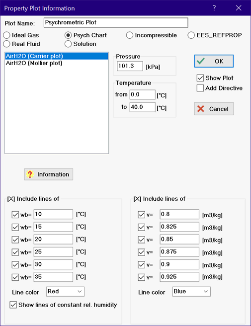 Selection of the Psych Chart button will result in a psychrometric plot for substance AIRH2O in either the Carrier or Mollier format as shown in the figure at the top right. AIRH20 allows lines of constant relative humidity, web-bulb temperature and specific volume to be placed on a psychrometric chart.