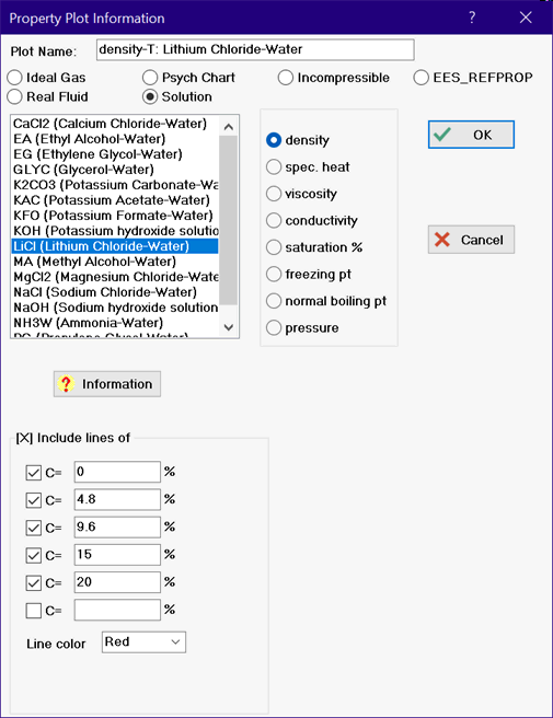 Selection of the Solution button will provide the option of plotting density, specific heat, viscosity, thermal conductivity, and vapor pressure as a function of temperature for up to six specified mass concentrations of the water-based solution , as shown in the figure at the bottom right. Also, the saturation mass %, freezing point, and normal boiling point of the solution can be plotted as a function of solution concentration.