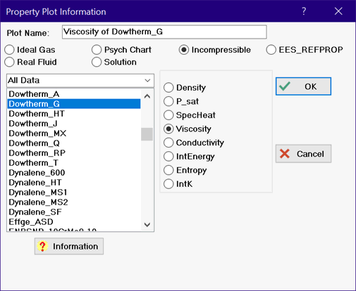 The Incompressible Substances library must be loaded before the plot can be created. If the selected library has not been loaded, you will be given the opportunity to load it before proceeding with the plot. The properties that are available to plot versus temperature are shown in the radio button list to the right of the list of substances. Different properties are available for different fluids. Note that the plots have not been spline-fit. You can turn on the spline fit using the Modify Plot command, as well as use symbols to show the actual data that are in the database. In some cases, only one data point is available in the library. In this case, the plot will show a single point.