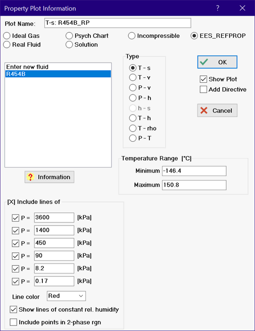 If you are using a Professional license, two check boxes named Show Plot and Add Directive will be available under the OK button. The default for Show Plot is checked, which results in a Property Plot being constructed and displayed immediately. If the Add Directive check box is checked, a $PropertyPlot directive will be inserted into the Equations window at the cursor position. The $PropertyPlot directive will create and display the plot when the equations are solved.