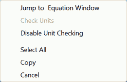 The first menu item "Jump to Equation window', will move the focus to the Equations window and place the cursor on the equation that was selected in the Residuals window. The second item, "Check Units" will check the units for the selected equation. This item is disabled if there is no unit errors in the selected equation. Selecting this item will display the message from the unit checking processor. If there is a unit consistency problem, the message dialog will offer the opportunity to open the Variable Information dialog for the equationin the equation being considered in which the units of each variable in the equation can be viewed and/or changed. The third item will enable or disable unit checking for this equation.