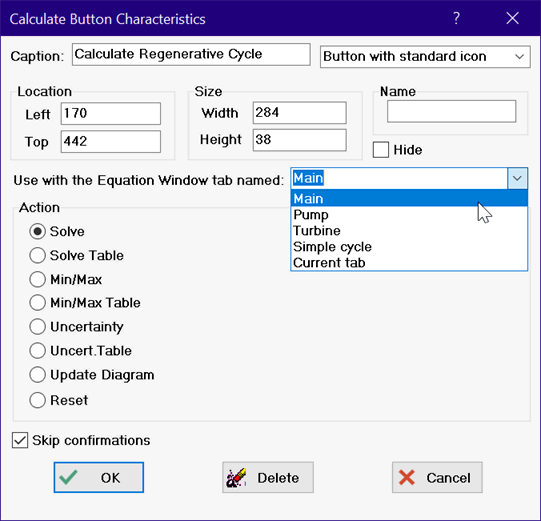 In the Professional license, the Calculate Button Characteristics dialog will have a field enabled in which a name can be entered for this calculate button. By default, this field is blank. If a name is provided, EES will create variables Name.left, Name.top, and Name.hide. (If an array name is provided, e.g., Name[1], the created variables will be names Name.left[1], Name.top[1], and Name.hide[1]). The created variables can optionally be assigned values in the EES program or with Radio button or Check box objects. For example, the visibility of the Calculate button created in the above dialog can be controlled by EES variable CalcButton1.Hide. Setting