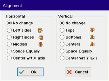 The Align button is enabled when two or more text items, lines, rectangles, ellipses or buttons are selected. These objects are created with the Add Text, Add Line, Add Rectangle, and Add Ellipse buttons. Buttons placed on the Diagram window may also be aligned. After selecting this button, the small dialog window shown above will appear showing alignment choices. Click OK to proceed with the alignment of the selected items.